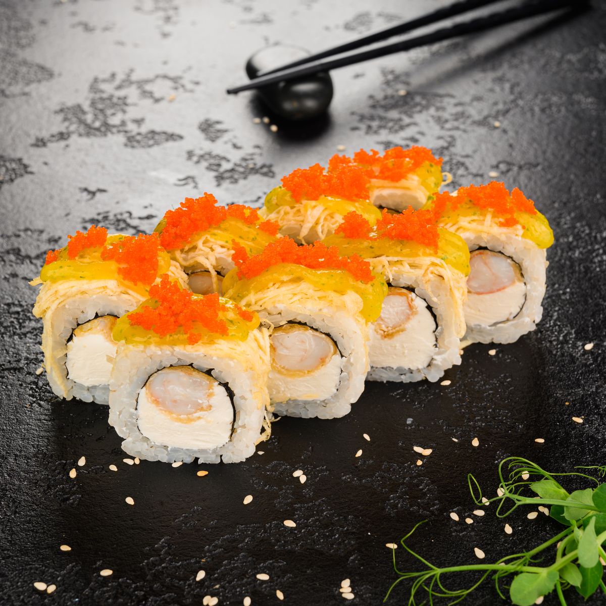 Сыр сливочно-творожный, креветка темпура, омлет, соус манго, икра тобико.