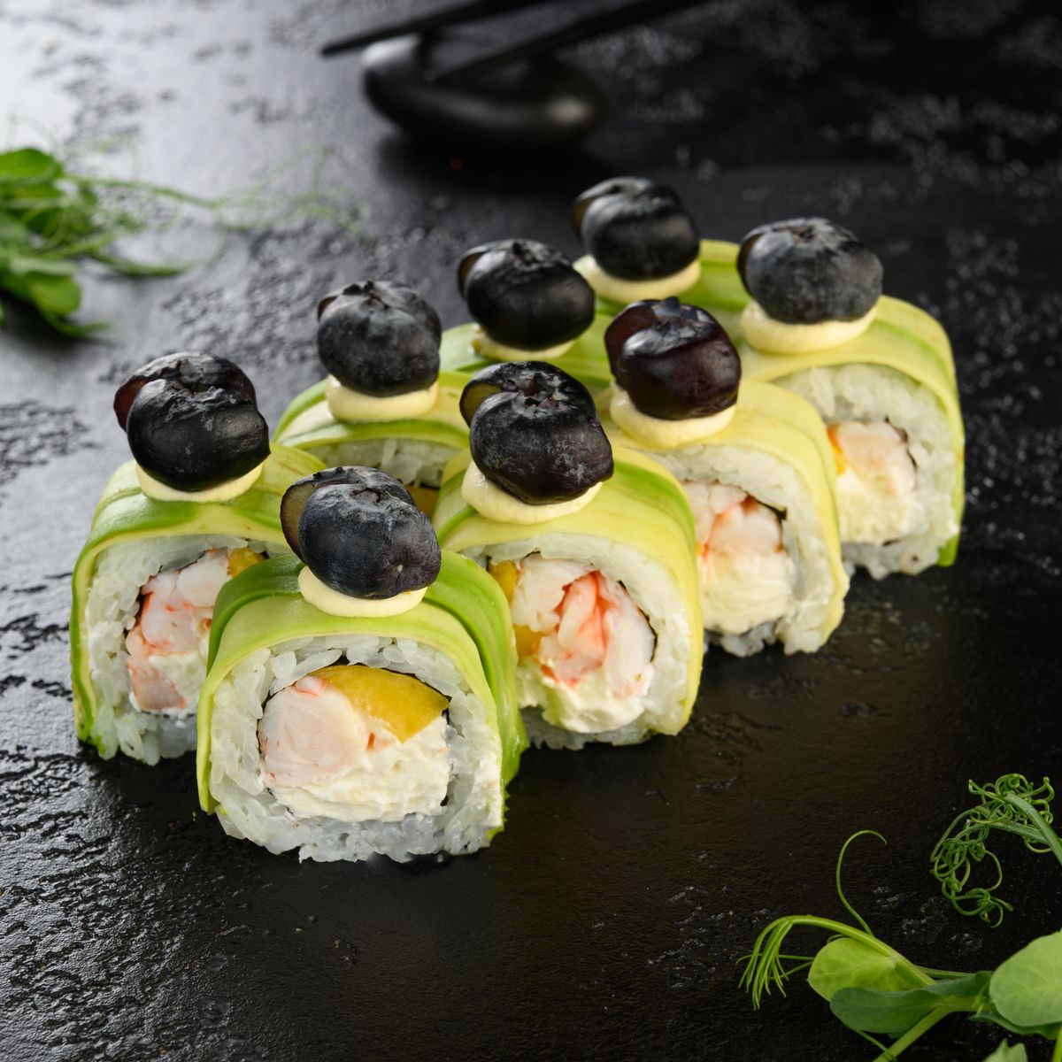Сыр сливочно- творожный, креветка, манго, авокадо, авторский сливочный соус, голубика.