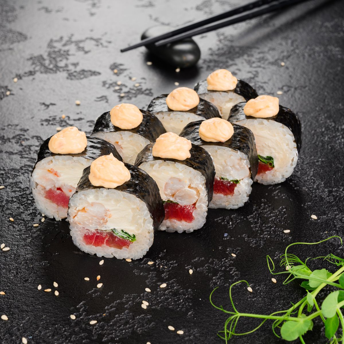 Тунец, креветка, сыр сливочно- творожный, лук зеленый, фирменный сливочный соус.