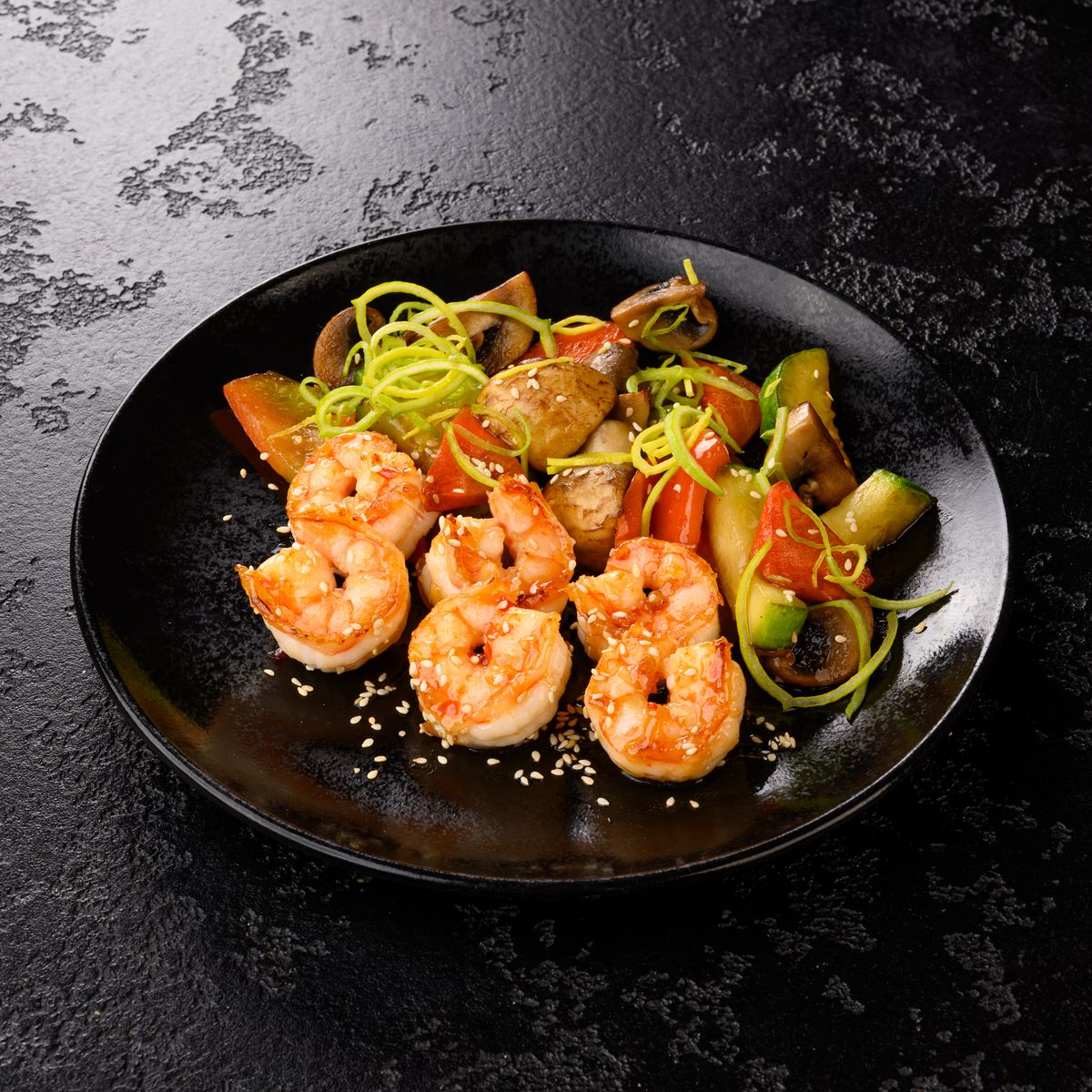 Креветки, соус сладкий чили, морковь, сладкий перец, лук репчатый, цукини, шампиньоны, кабачок, соевый соус, кунжут, лук порей.