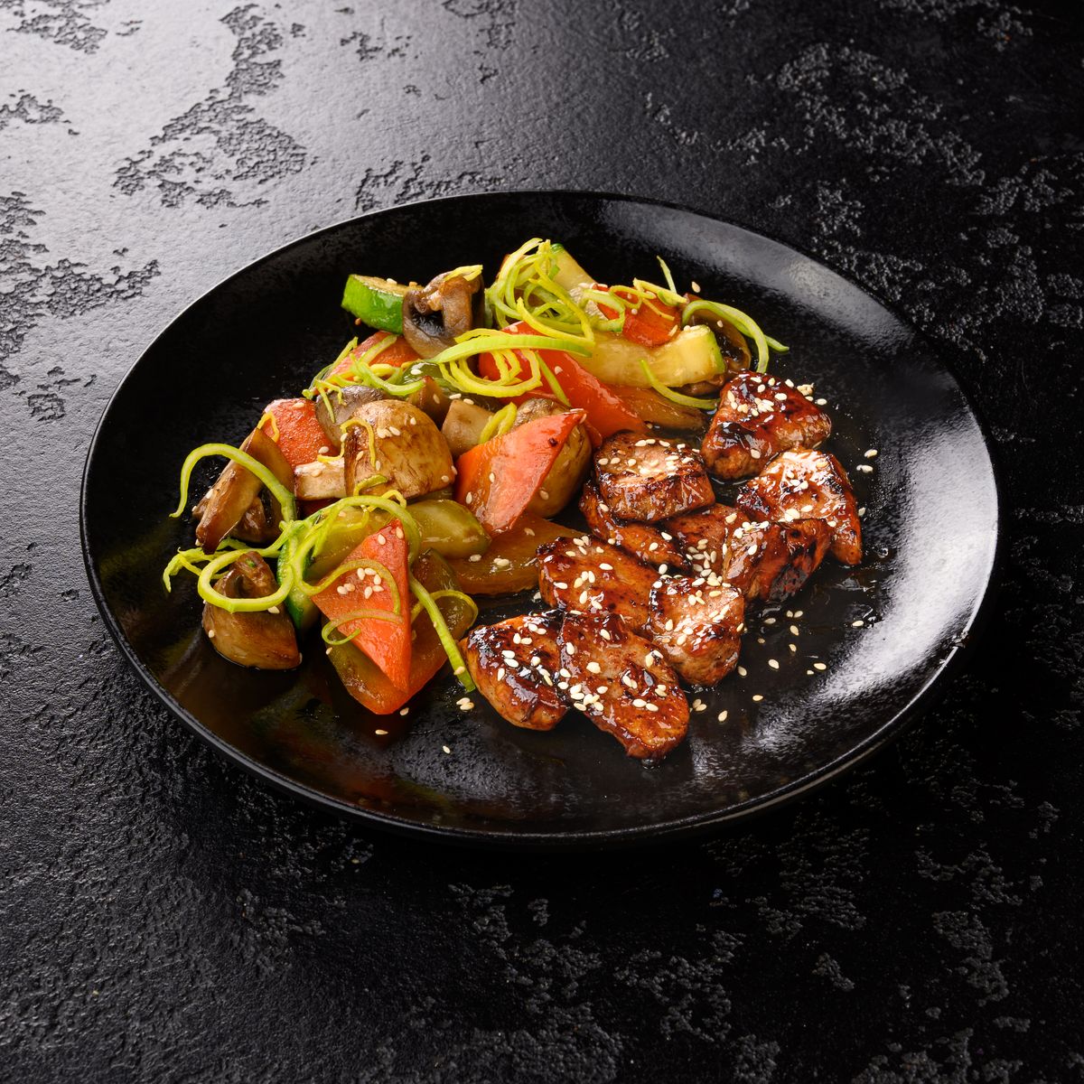 Куриное филе, соус унаги, морковь, сладкий перец, лук репчатый, цукини, шампиньоны, кабачок, соевый соус, кунжут, лук порей.
