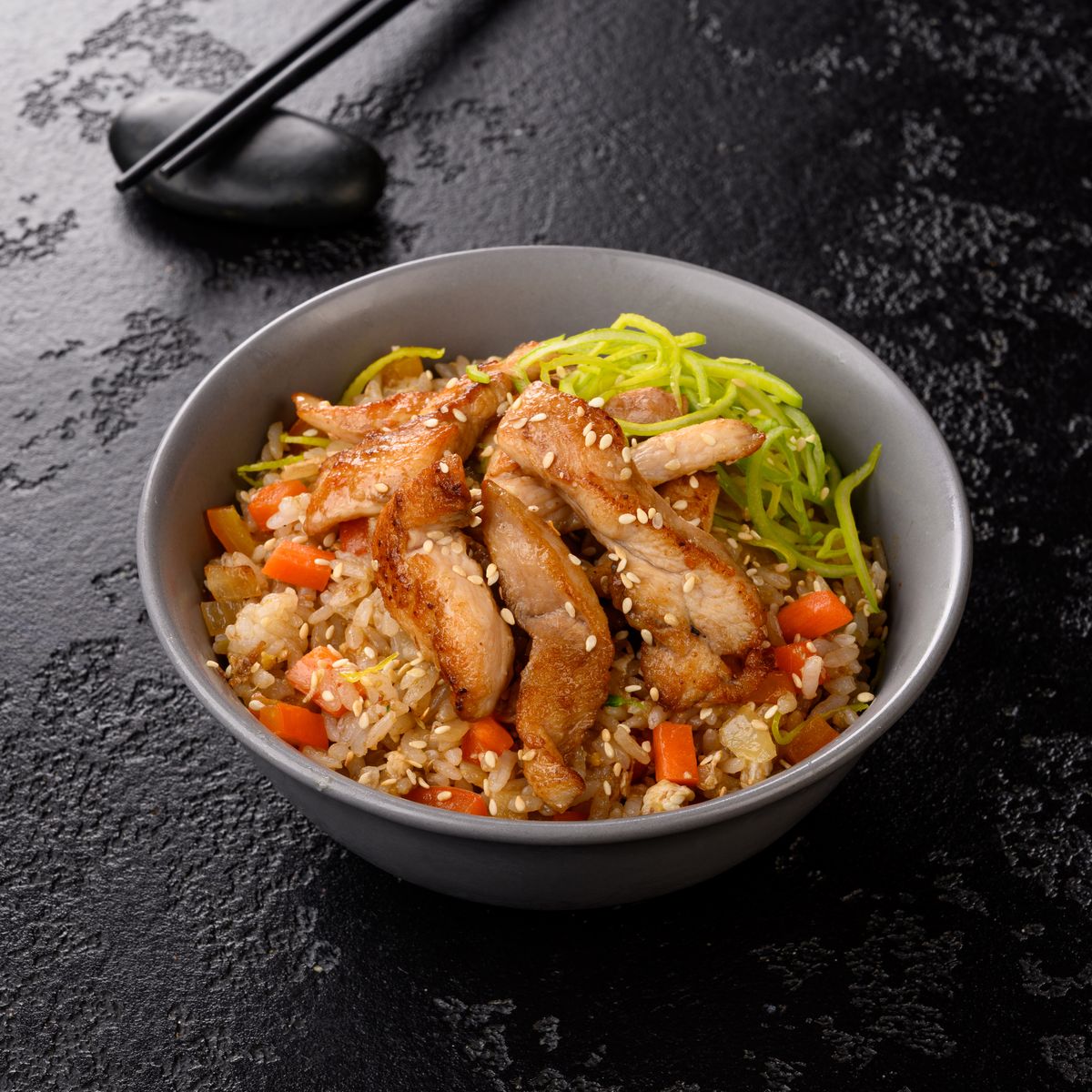 Чесночный рис, филе куриное, морковь, сладкий перец, лук репчатый, соевый соус, кунжут, лук порей.