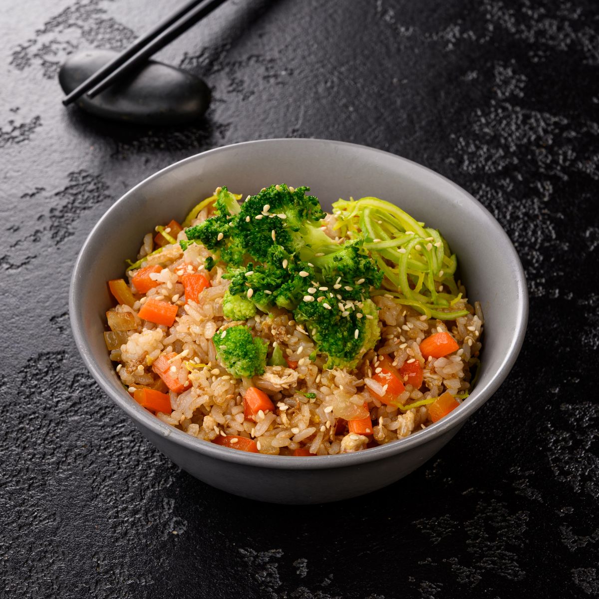 Чесночный рис, морковь, лук репчатый, сладкий перец, брокколи, соевый соус, кунжут, лук порей.
