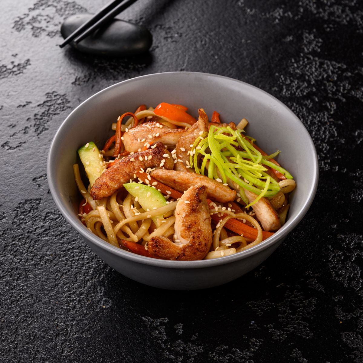 Лапша пшеничная, лук репчатый, стручковая фасоль, морковь, перец болгарский, куриное филе, кунжут, лук зеленый
