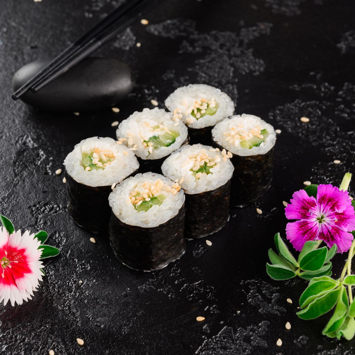 Огурец, сливочно-творожный сыр. В стоимость входят имбирь, васаби, соевый соус
