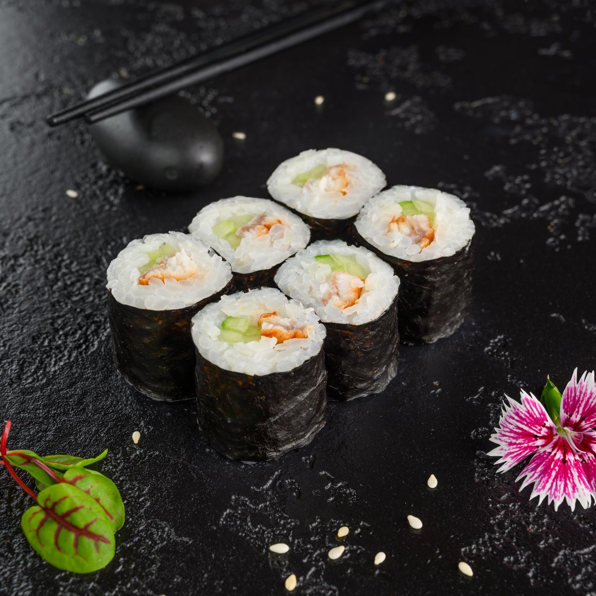 Угорь, огурец, соус терияки, кунжут. В стоимость входят имбирь, васаби, соевый соус