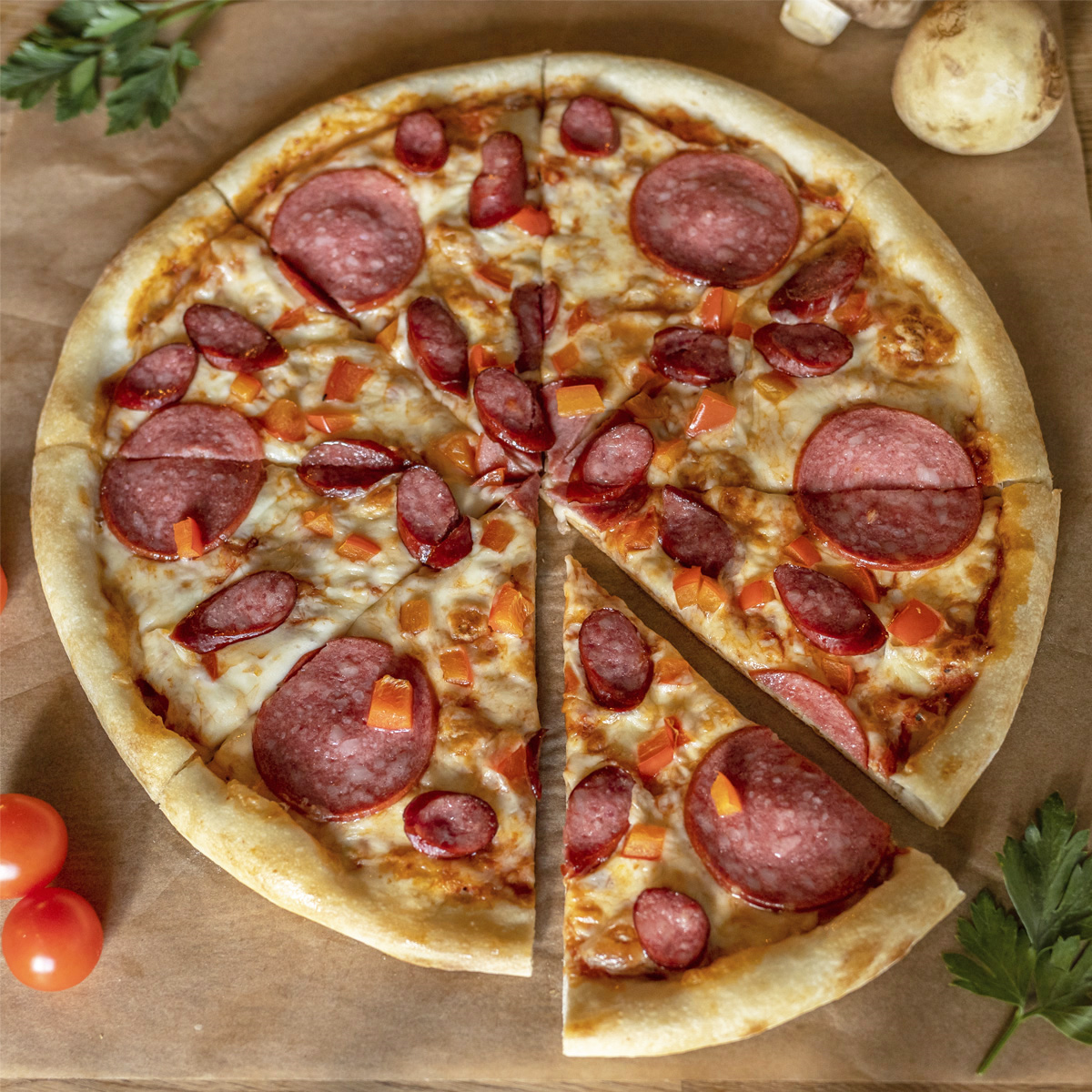 Колбаски охотничьи, сладкий перец, сервелат, соус томатный, сыр моцарелла