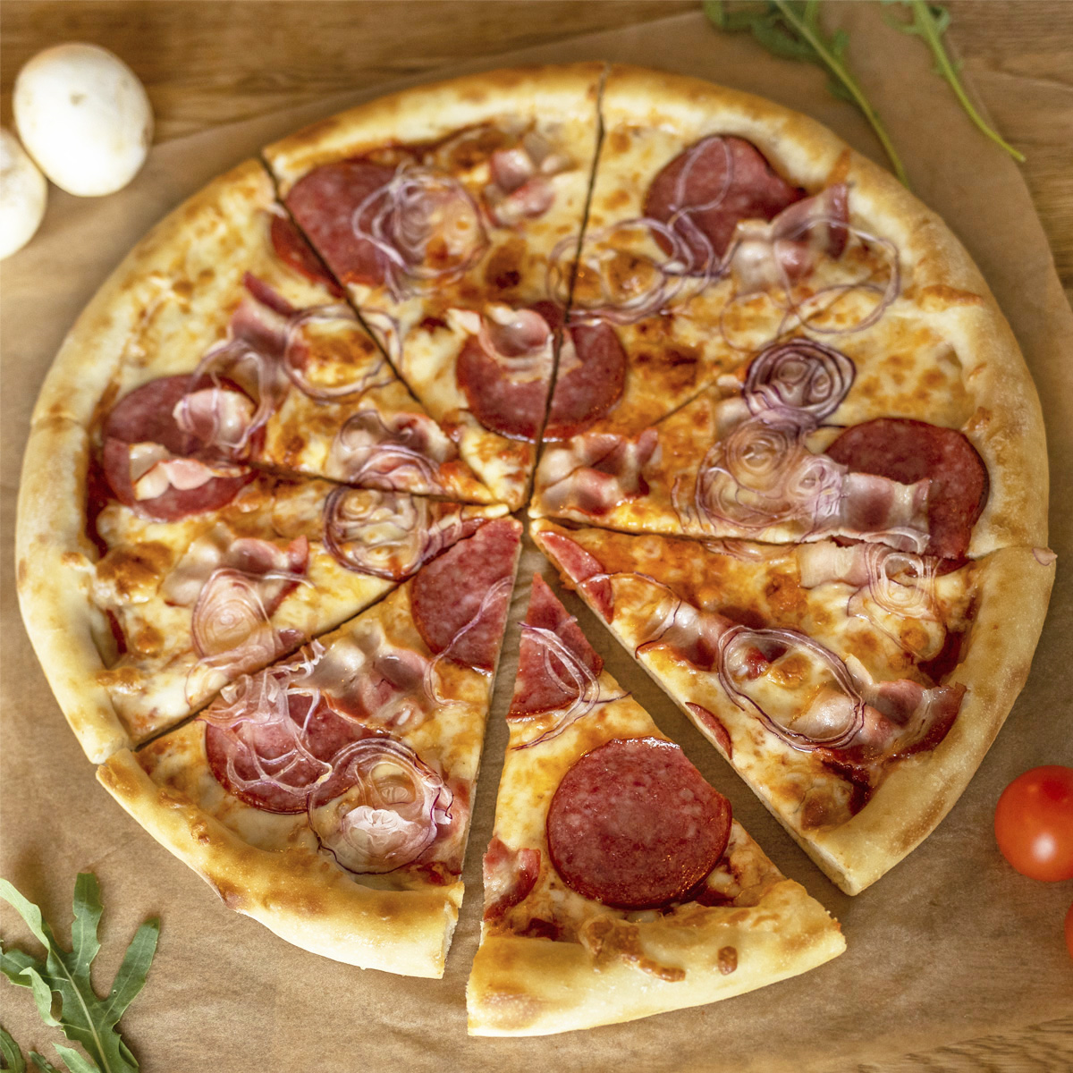 Бекон, соус томатный, сервелат, красный лук, сыр моцарелла