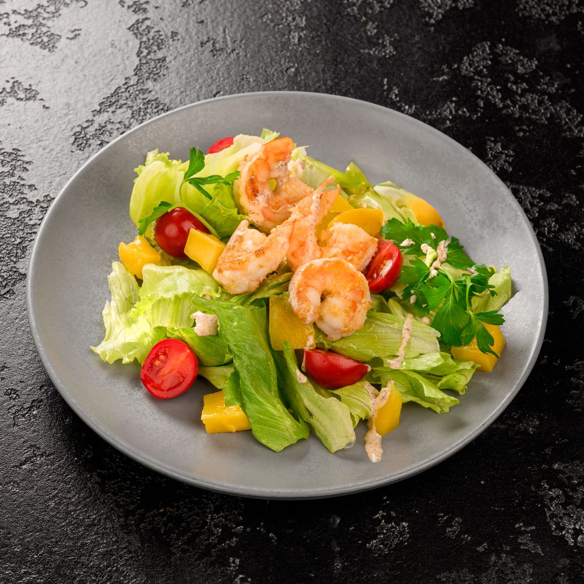Нежные креветки, обжаренные в чесночном масле, в сочетании со сладким манго, хрустящим айсбергом и черри. Заправлен ореховым соусом, украшен зеленью и кунжутом.