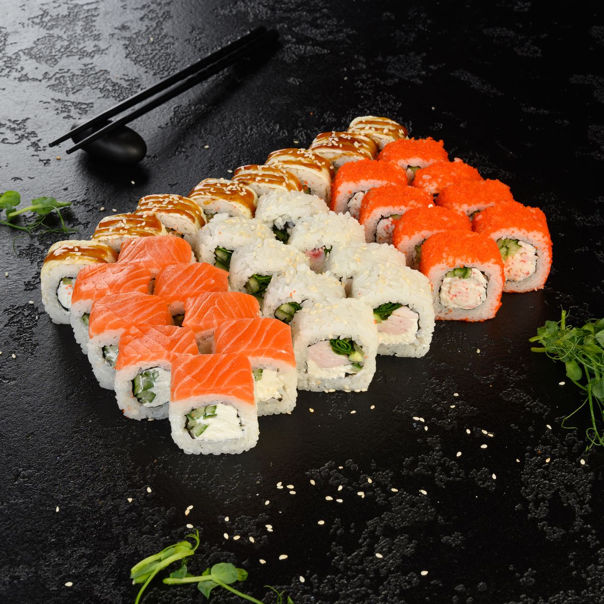 - Тамаго маки (Икра тобико, огурец, сливочно-творожный сыр, японский омлет, соус терияки, кунжут)
