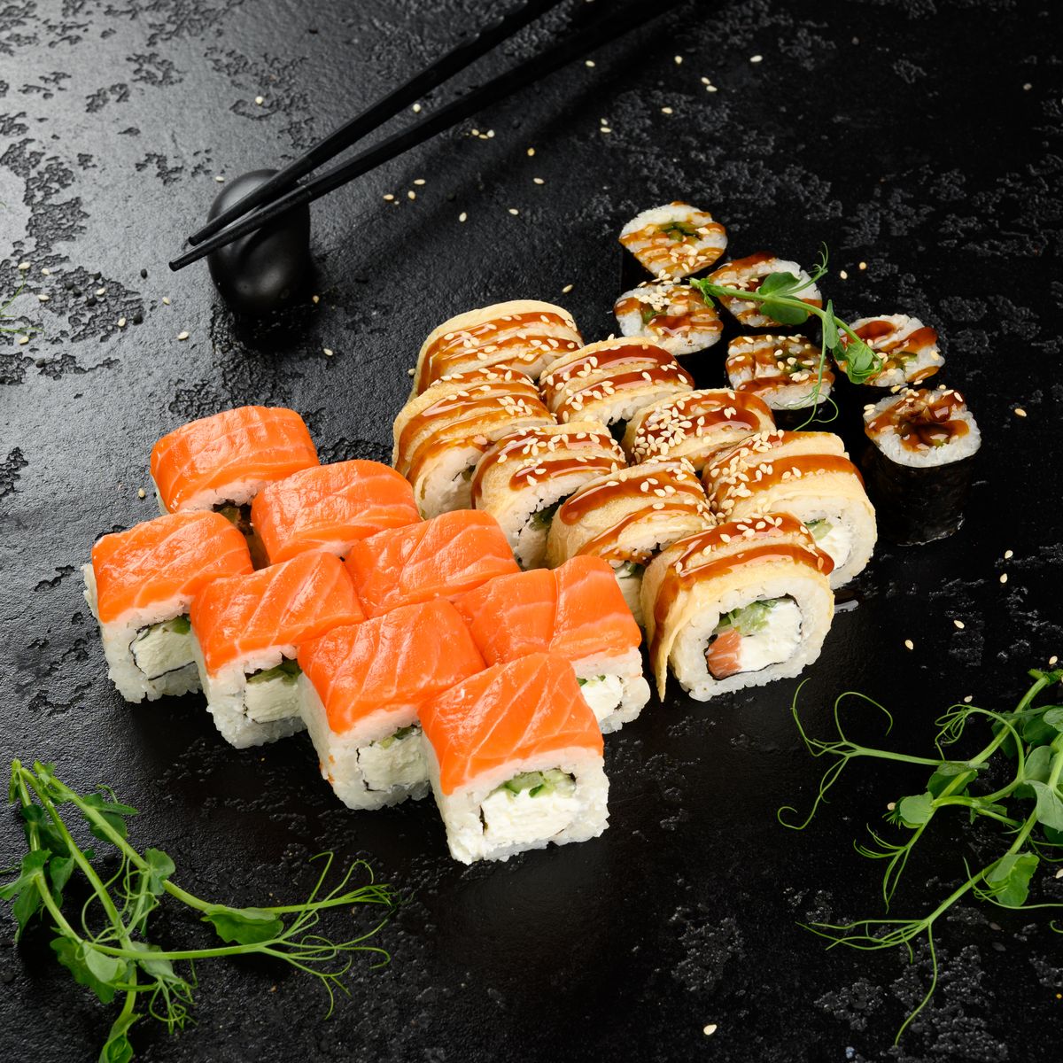 -Юка с лососем ( Лосось, сливочно-творожный сыр, японский омлет, огурец, соус терияки, кунжут)