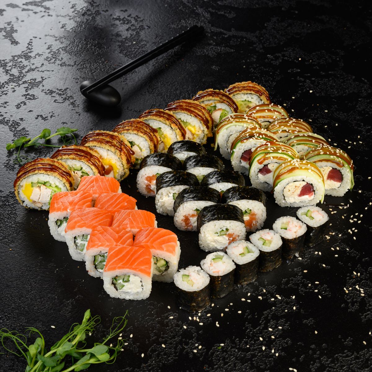- Парадайс (Тунец, японский омлет, сливочно-творожный сыр, огурец, соус терияки, кунжут)