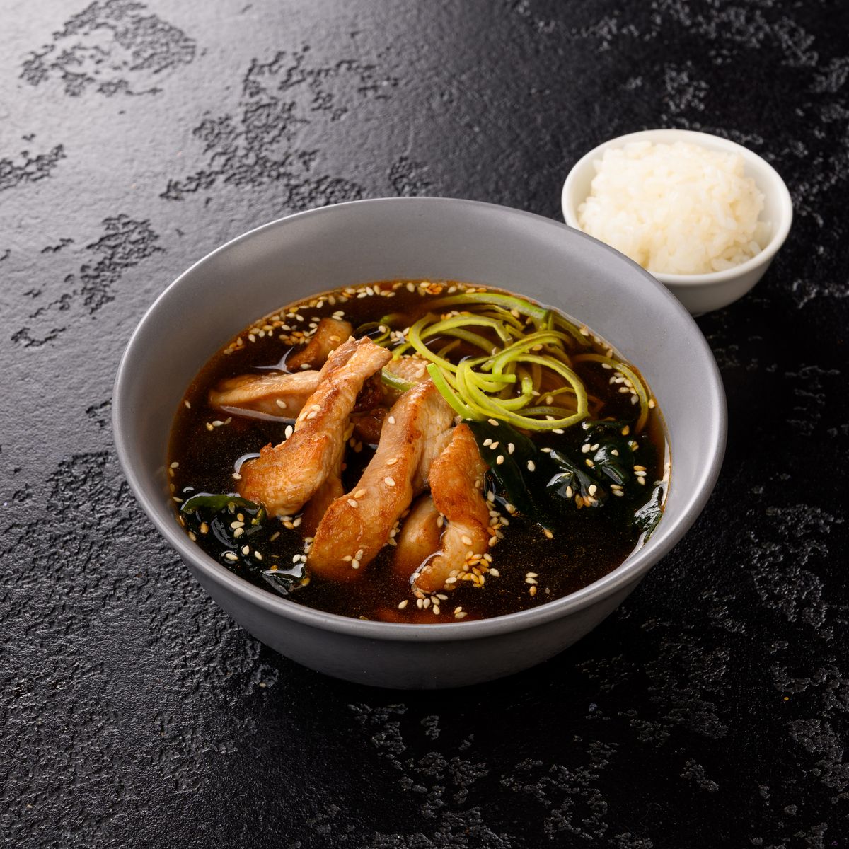 Японский бульон, курица, водоросли вакаме, лук порей, кунжут, подается с рисом